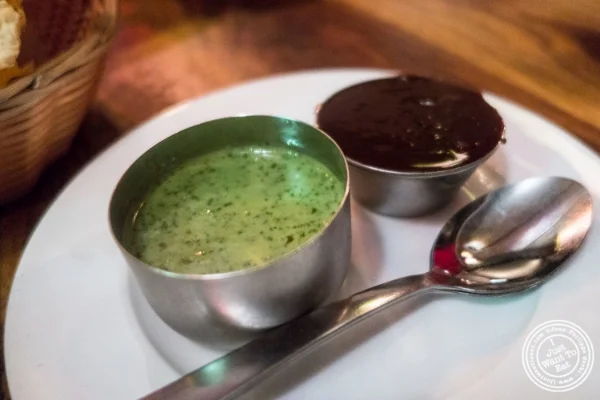 Mint and cilantro sauce (left) / Tamarind sauce (right) at Baluchi's, Indian restaurant in Tribeca, NYC, New York