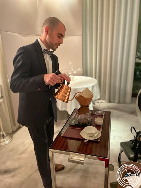 This voyage was 10 courses with a choice for the entree and the dessert, each dish being described in French and in English that was a nice touch for Jodi, sometimes giving a bit of a background as to the origin or the process to make them that can be a bit complex and can only push your admiration further for such a craft. I should also mention the pairing: they propose the classic wine pairing with even one variation with only rare bottles, but also a non-alcoholic pairing that is mainly composed of tea and coffee, but not something basic: each tea or coffee has a story and several are being made table side with some detailed explanation of the process.