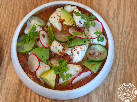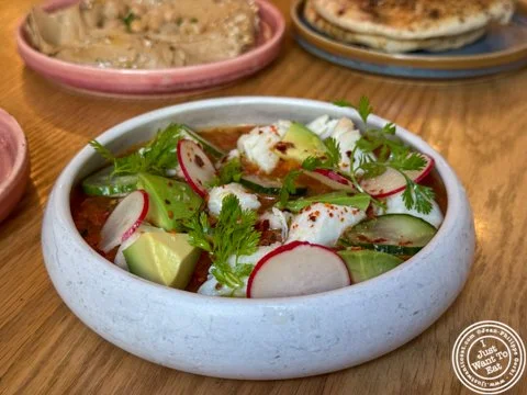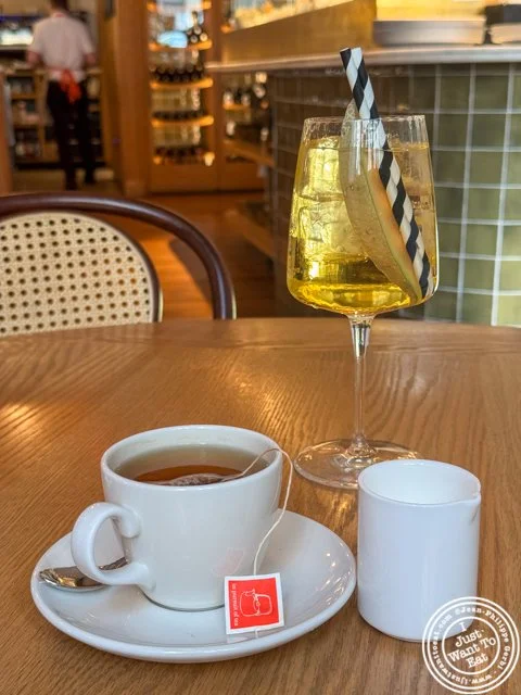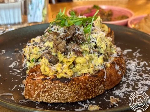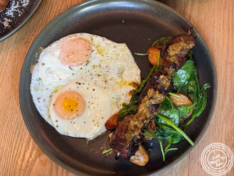 For brunch they have a prix fixe that, for $50 per person, includes 2 spritzes (they have a creative selection), black garlic hummus and one entree, marked by a “PF” on the menu. In that spritzes section was the Cavaillon Melon Kir ($20), made with Maison Artonic Melon Liqueur, Contratto Bianco and White Wine, that I found quite refreshing and unique. Of course, if you prefer tea ($4) or coffee, they have a good selection as well.