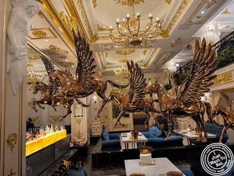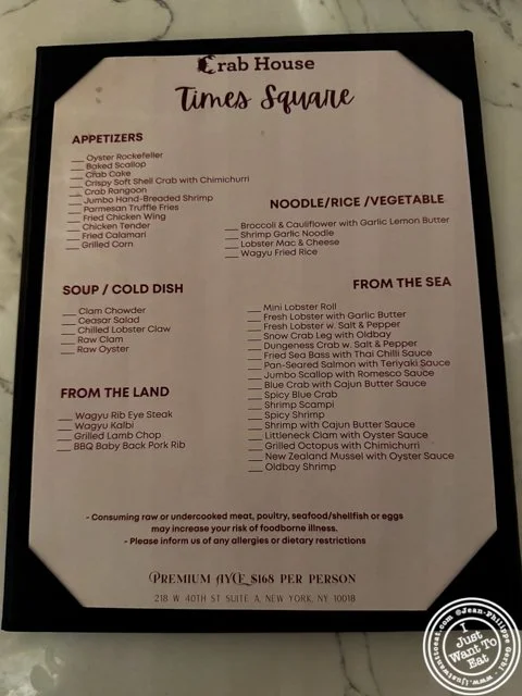 If you always wanted to eat like a king, you should go to Crab House Times Square: the opulent decor, from the main dining room behind the bar to the various private rooms, with its gold Pegasus and giant chandelier will certainly make you think that you are royalty. The food as well: this is an all you can eat (AYCE) restaurant, where, for $168, you have two hours, from the time your drinks arrive, to ordering from their menu, from mainly seafood options to Wagyu ribeye lit on fire, Wagyu kalbi (rib) or Wagyu fried rice, with very limited vegetarian options that would not make sense in such place. The way it works is simple: they give you a menu with all the options, that you will mark with an X, and they will bring it to the table fairly quickly. Apparently, the food is cooked to order rather than buffet style. And I am glad that they sat us at a large table, because when the food arrives, mostly at once, you need lots of space. The table was fine, but I admit that a couch is not the most comfortable seat when eating, even if you can bring it closer to the table, and for sure, regardless, the bib they provide is strongly suggested.