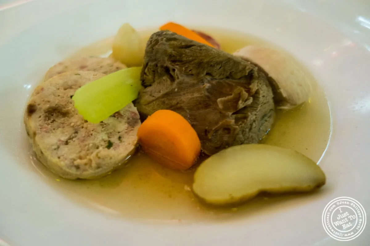 The way you eat it is by adding the condiments, whichever you want, to the Bollito Misto. I first took each of these condiments and put them on the side of my plate to try each of them. Then, Mamma Egi grabbed the salsa verde and put a bit of it on the different pieces of meat that were on my plate, simply telling me: "Try this way, this is the way we do it". So I tried it this way! Before I explain what I though about the dish, let me tell you what was in there: there was capon and beef sausage, with vegetables, bathed in a light broth. At sight, I could see the similarities with the pot-au-feu, although, in a pot-au-feu, there is usually more vegetables and less varieties of meat. However, the concept and taste were very close, bringing me back to my childhood. I admit that, when I was a kid, I was not fond of this type of dishes. Maybe with the condiments, it would have been different, as they add a bit of fun and creativity in a way to the dish. My favorite piece of meat was the chicken and beef sausage: very tasty and comforting, Mamma Egi told me that she used to make it to make sure her sons would eat chicken. You can find the