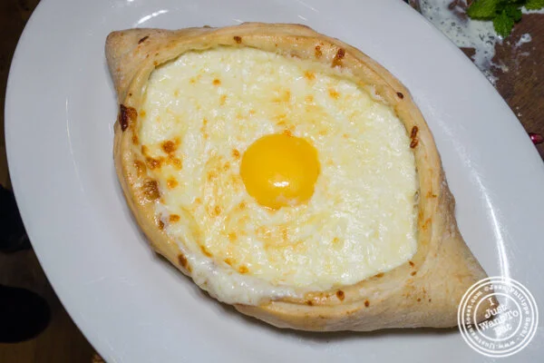 Interestingly, Chama Mama means « Eat Well Dad ». « Mama » being the word for « Dad » and « dida » Mom, Georgian being one of the sole languages to reverse the two. Eating well is definitely not an issue there as they offer lots of mouth watering dishes, some vegetarian, perfect to share, with an emphasis on their bread, the « puri », especially the katchapuri adjarui that is like a small bowl with cheese and an egg yolk that they would mix, at the table, with a generous piece of butter, creating a fatty cheesy cream. This is a must have for sure but is a bit filling: the bread is amazing and I would eat it just like that, without anything on it. I especially loved the crunchiness of the crust.