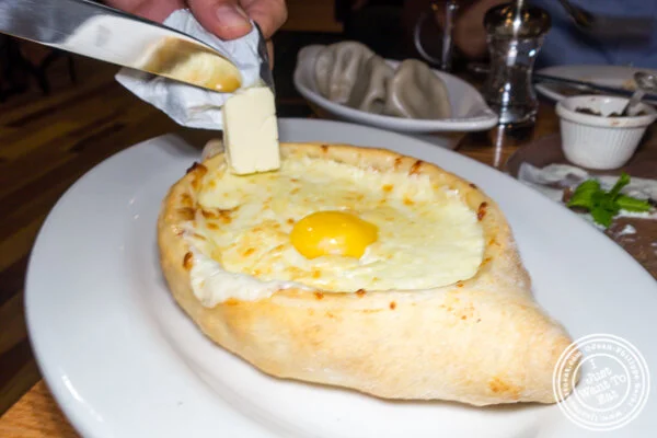 It is not that often that you see a Georgian Bakery and restaurant opening and when Chama Mama opened last Spring, it got people talk (I am talking about the Eastern European country). Replacing a Cuban restaurant in Chelsea (El Paraiso), Chama Mama is a casual place with in the kitchen in the middle, visible from the dining room and exhibiting their « tone », a very large clay oven that apparently every Georgian home has (in a smaller version) and where they cook bread most of the day (this one uses gas).